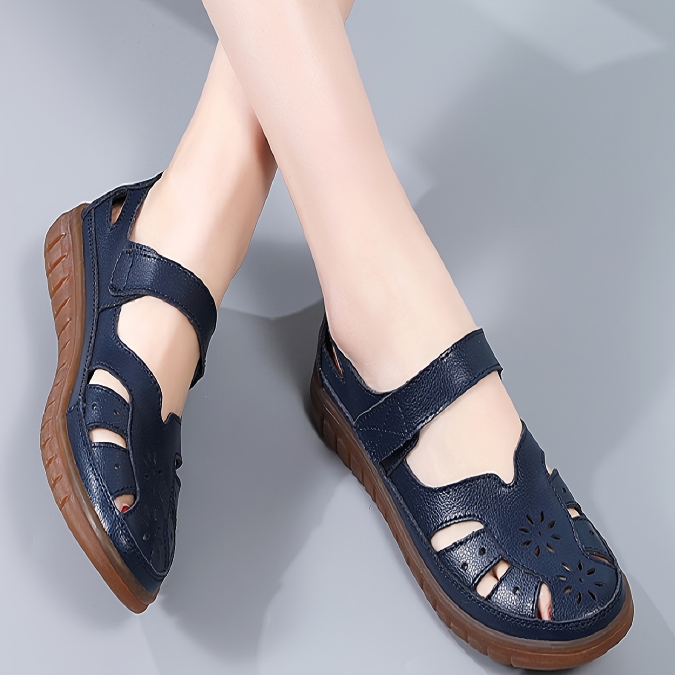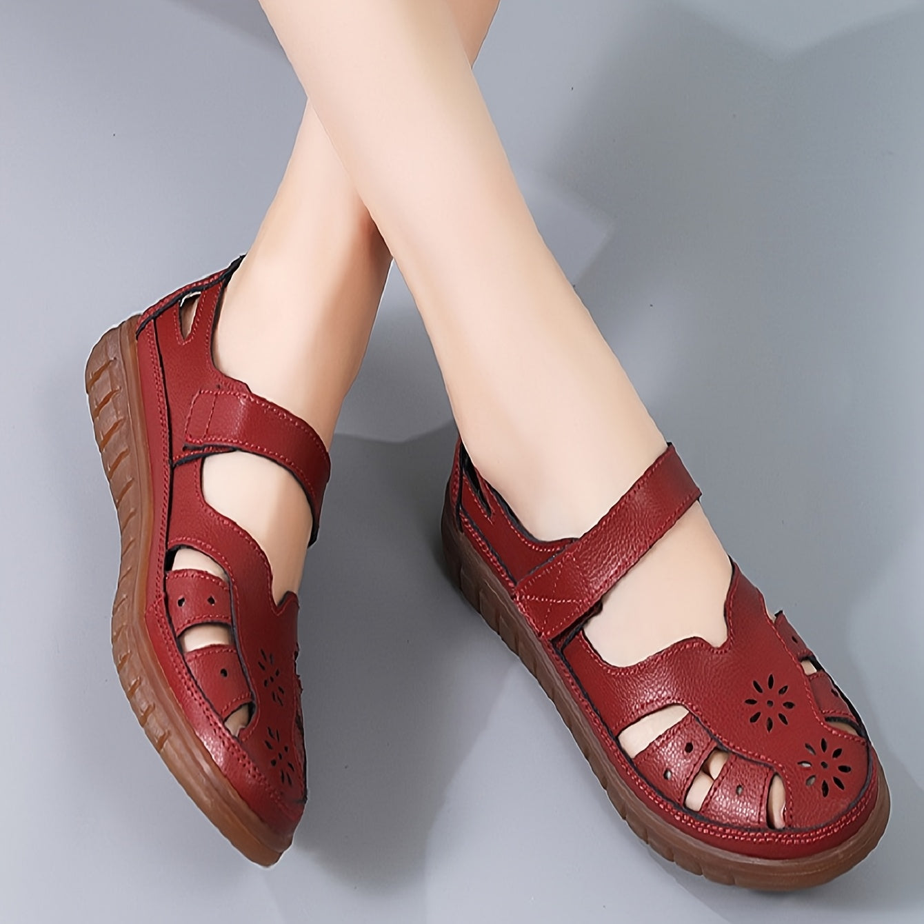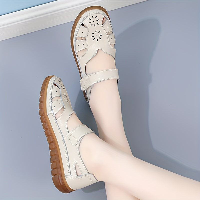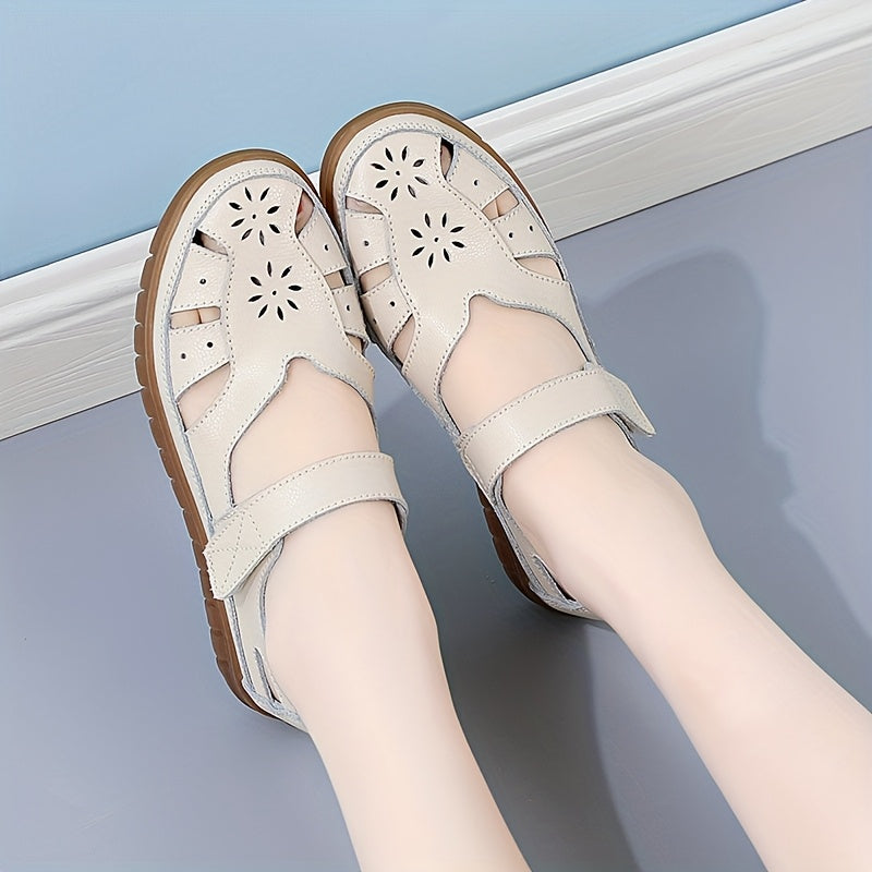 Women's Genuine Leather Mary Jane Flat Sandals - Adjustable Straps, Breathable Summer Casual Shoes with Rubber Sole, Round Toe & Solid Color Design, Everyday Comfort Footwear, Classic Bucket Style, Durable Traction Footwear